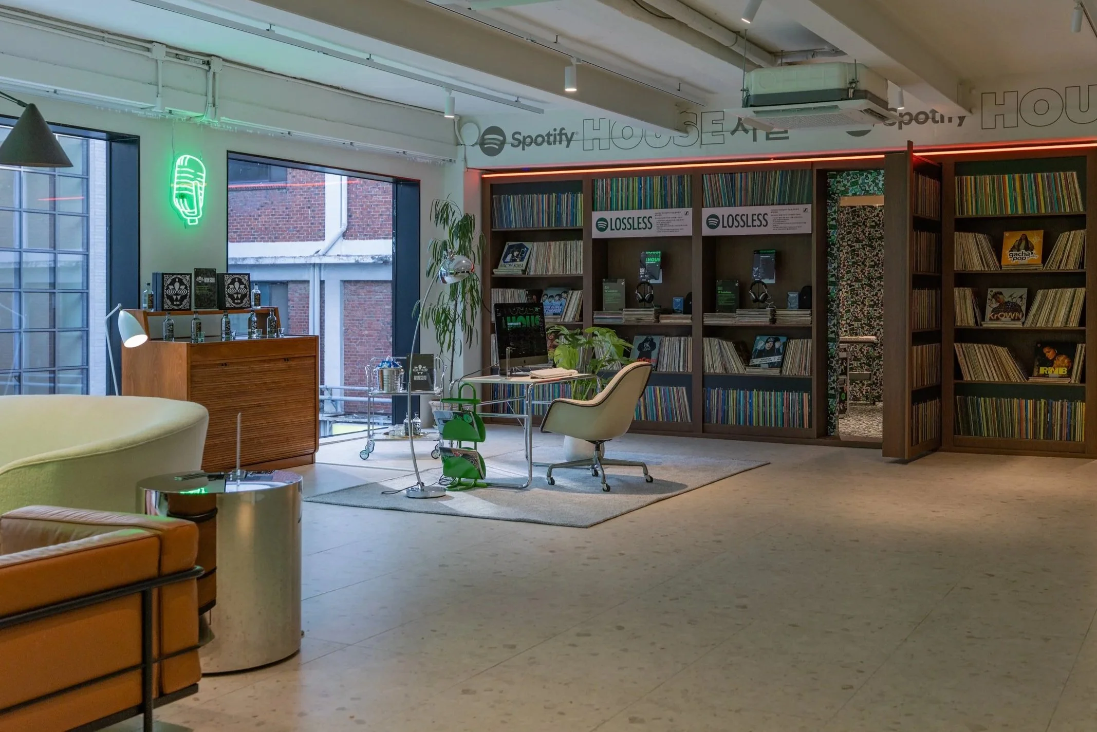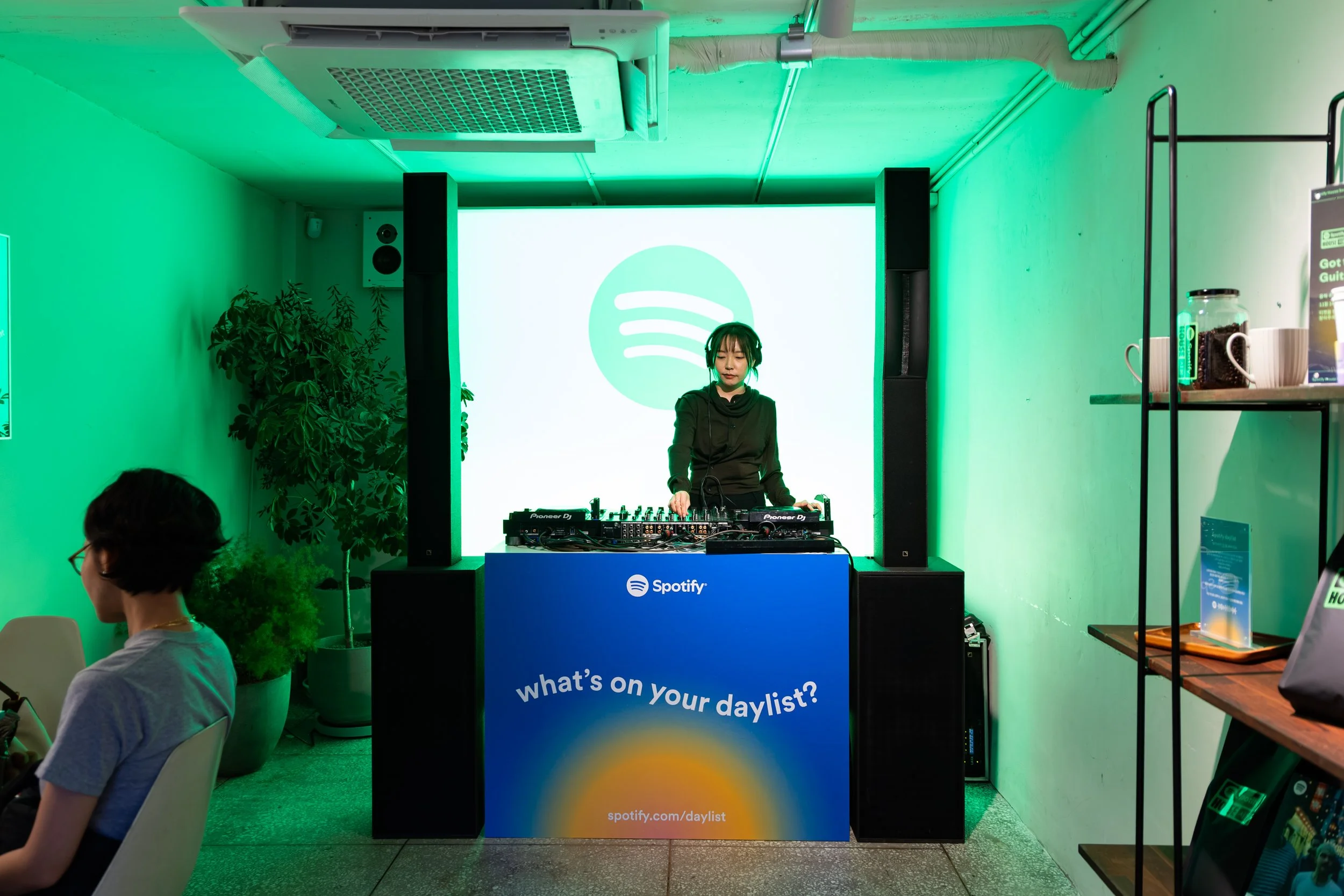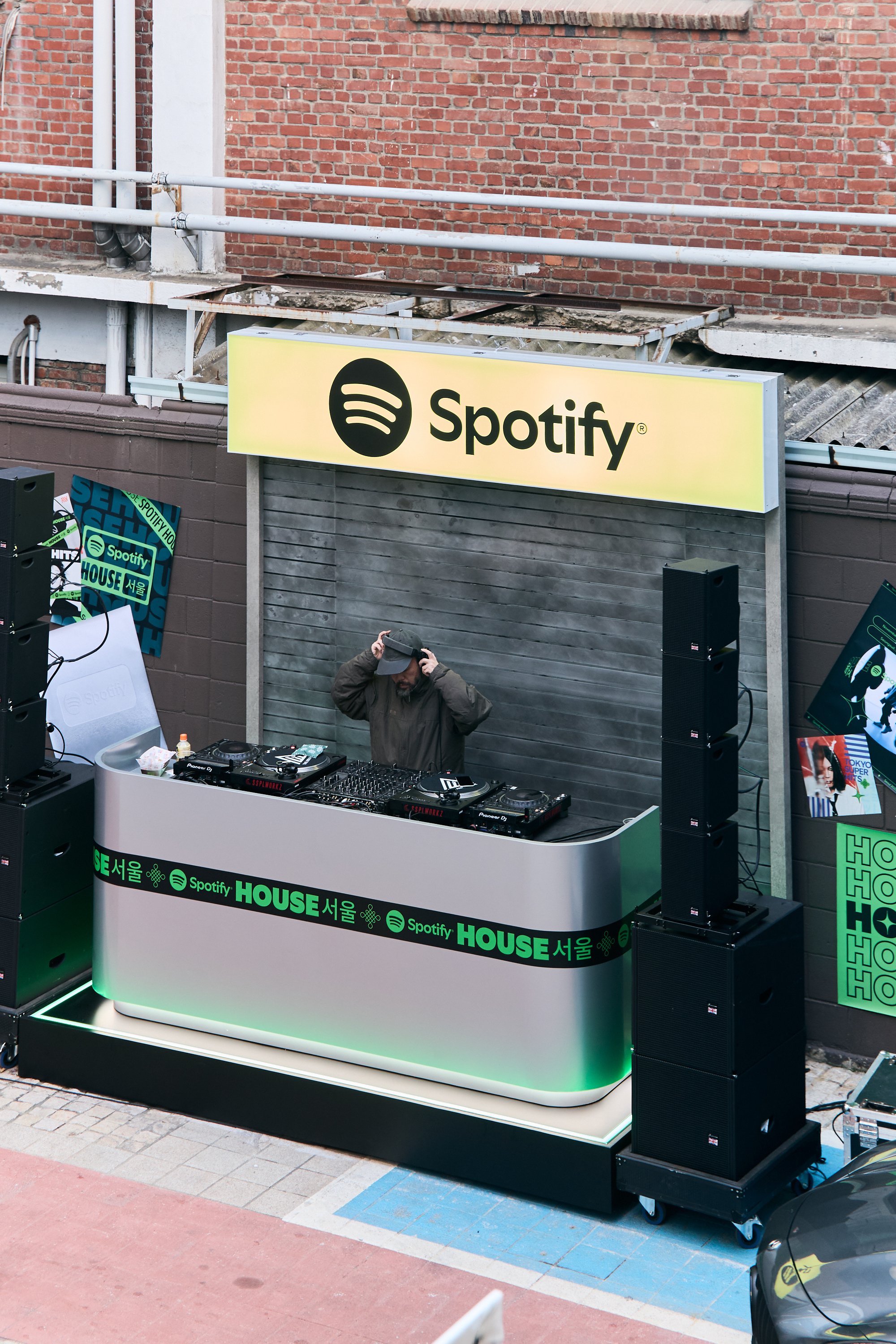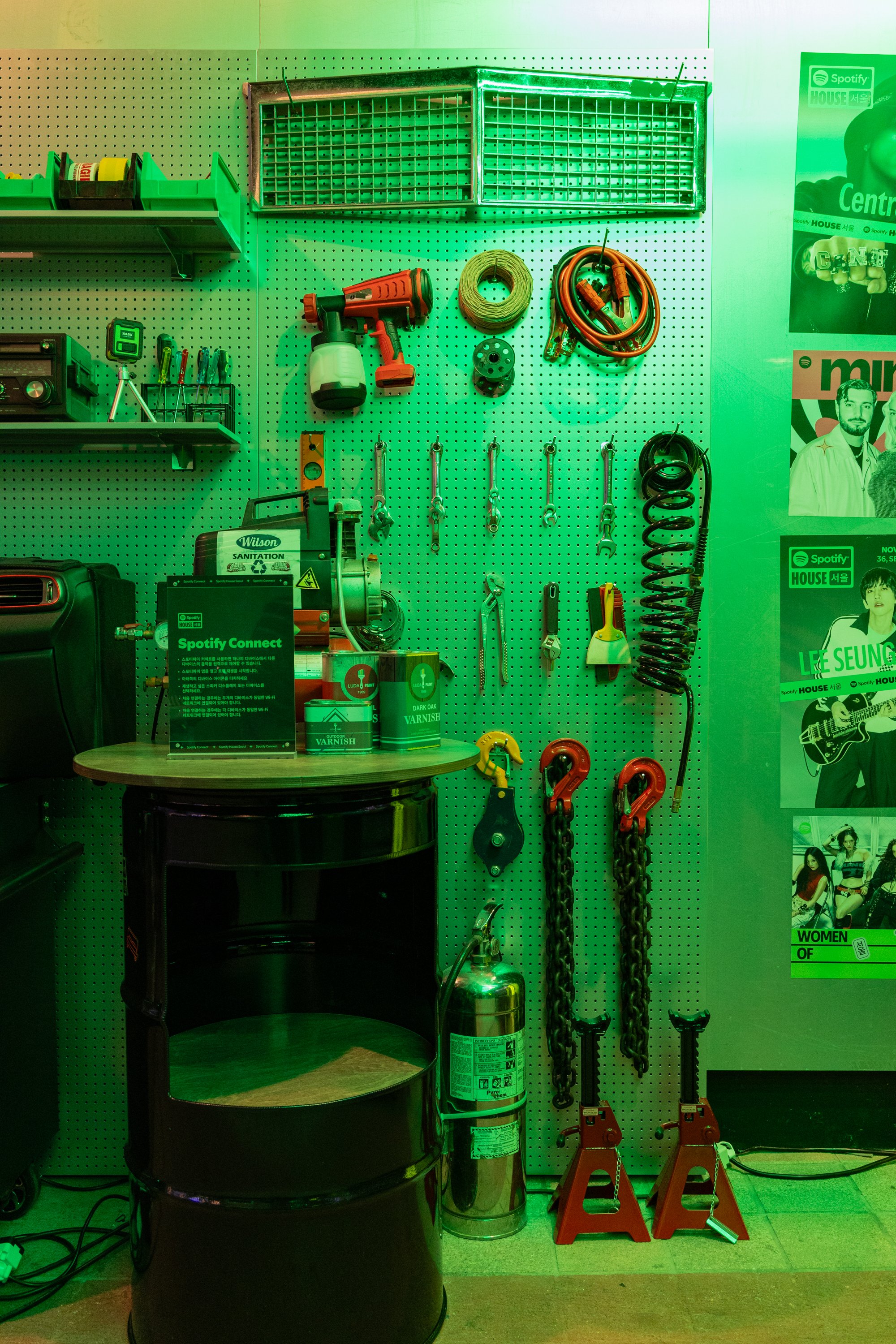 Guests entered and checked-in to Spotify House Seoul through The Connect Garage. After receiving their wristbands and maps, guests used a custom dashboard featuring Spotify Connect to play their favorite tracks via Carplay and Bluetooth, while promos for Spotify’s new Music Video feature looped on a TV nearby. Finally a green-lit Mercedes by lifestyle car culture brand Peǎches offered a photo-op on the way into Audiophile Alley.