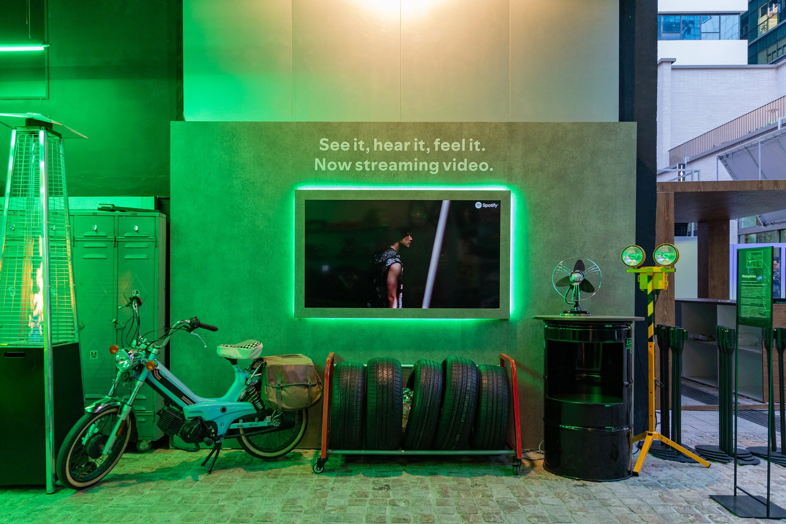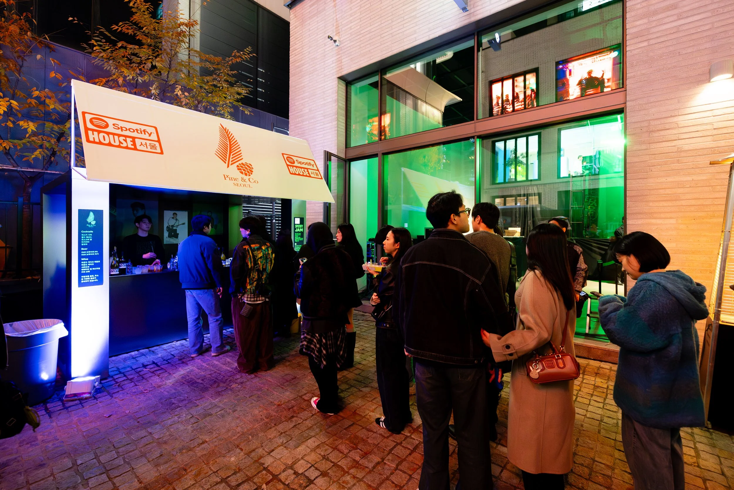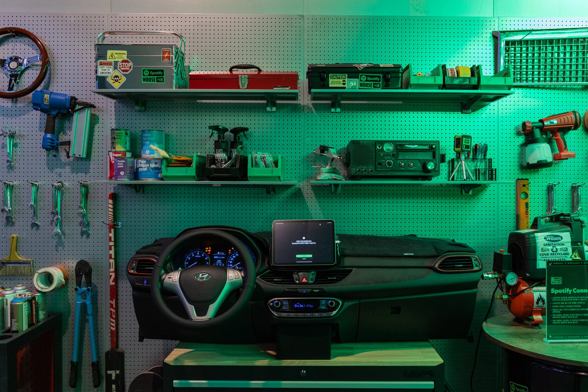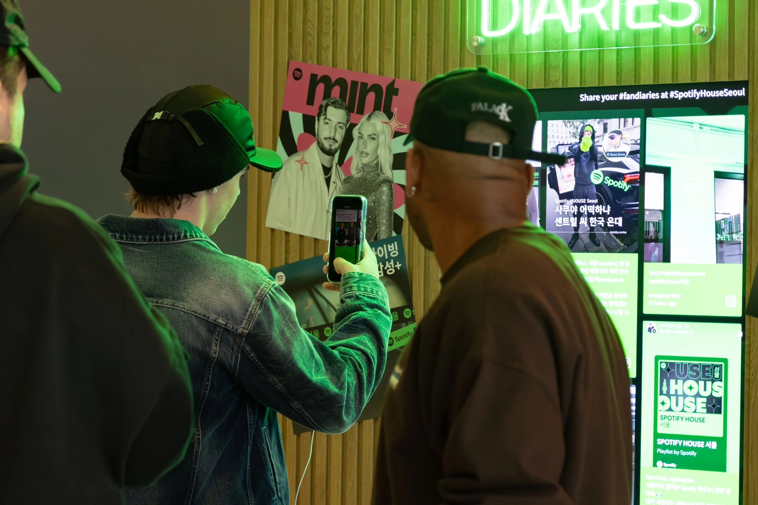 Guests entered and checked-in to Spotify House Seoul through The Connect Garage. After receiving their wristbands and maps, guests used a custom dashboard featuring Spotify Connect to play their favorite tracks via Carplay and Bluetooth, while promos for Spotify’s new Music Video feature looped on a TV nearby. Finally a green-lit Mercedes by lifestyle car culture brand Peǎches offered a photo-op on the way into Audiophile Alley.