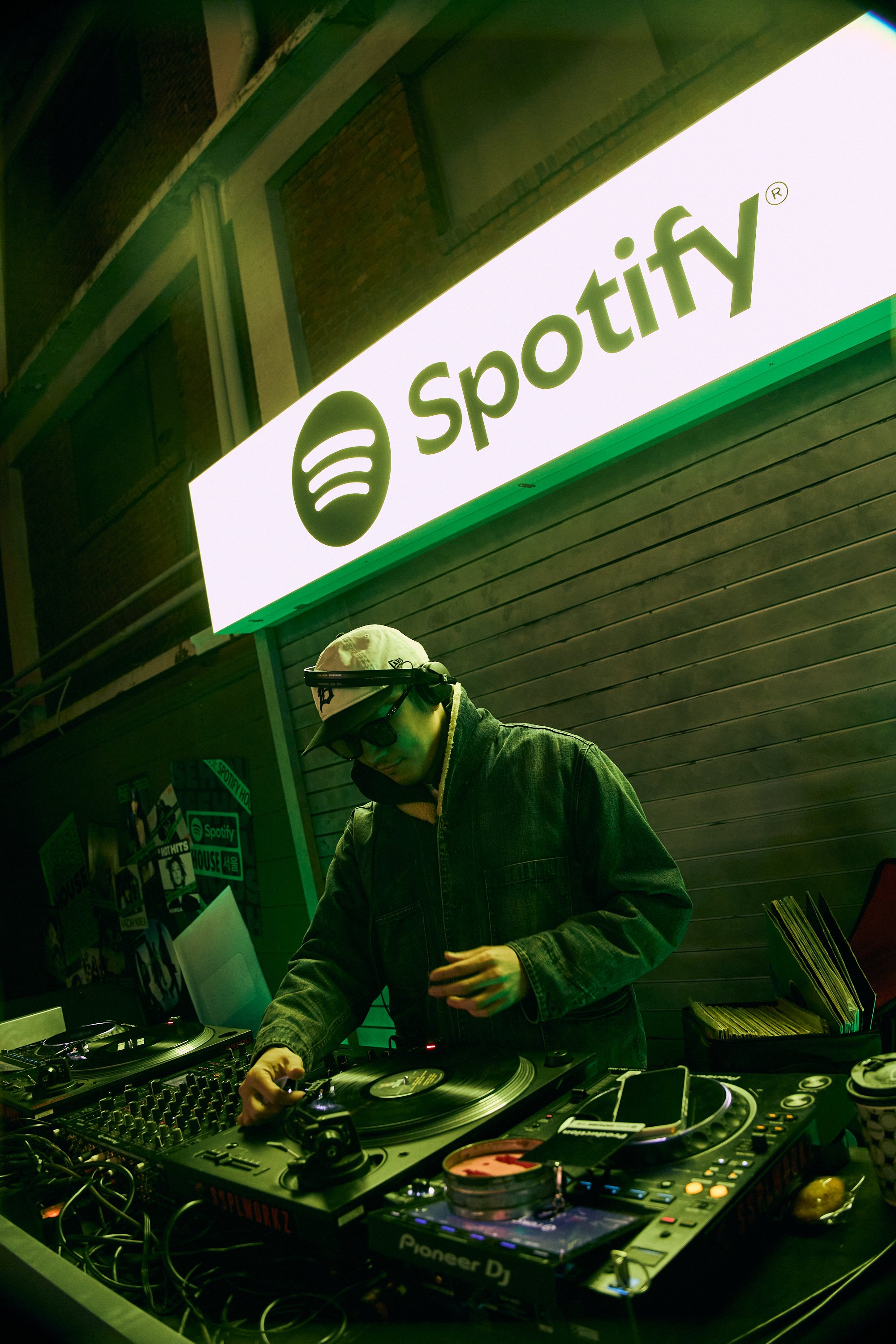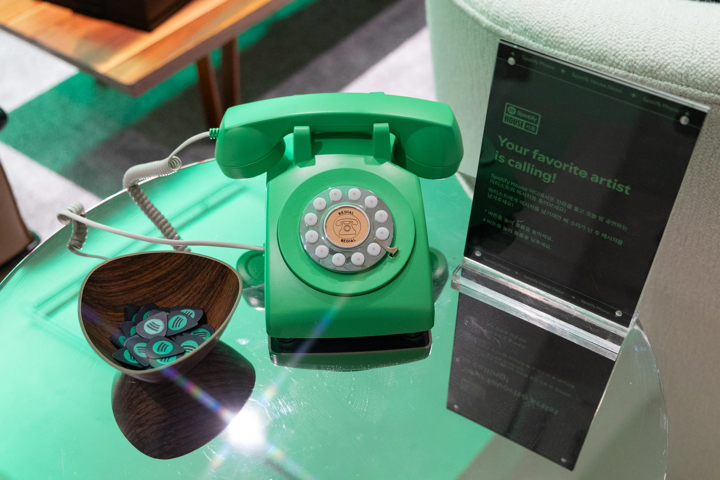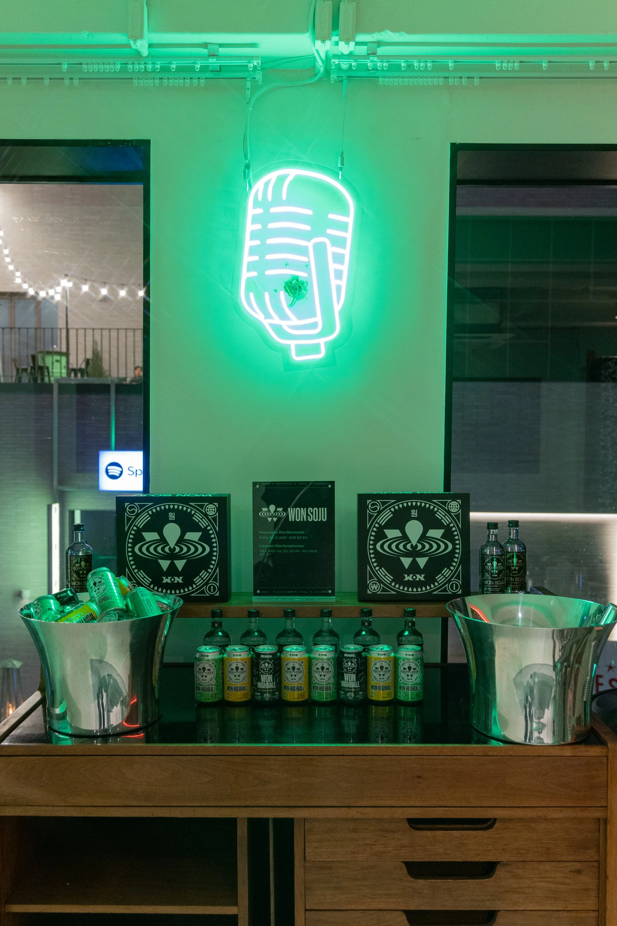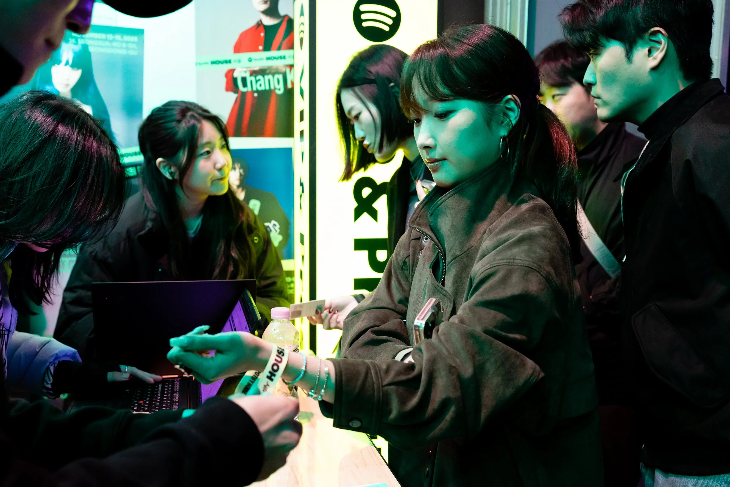 Guests entered and checked-in to Spotify House Seoul through The Connect Garage. After receiving their wristbands and maps, guests used a custom dashboard featuring Spotify Connect to play their favorite tracks via Carplay and Bluetooth, while promos for Spotify’s new Music Video feature looped on a TV nearby. Finally a green-lit Mercedes by lifestyle car culture brand Peǎches offered a photo-op on the way into Audiophile Alley.