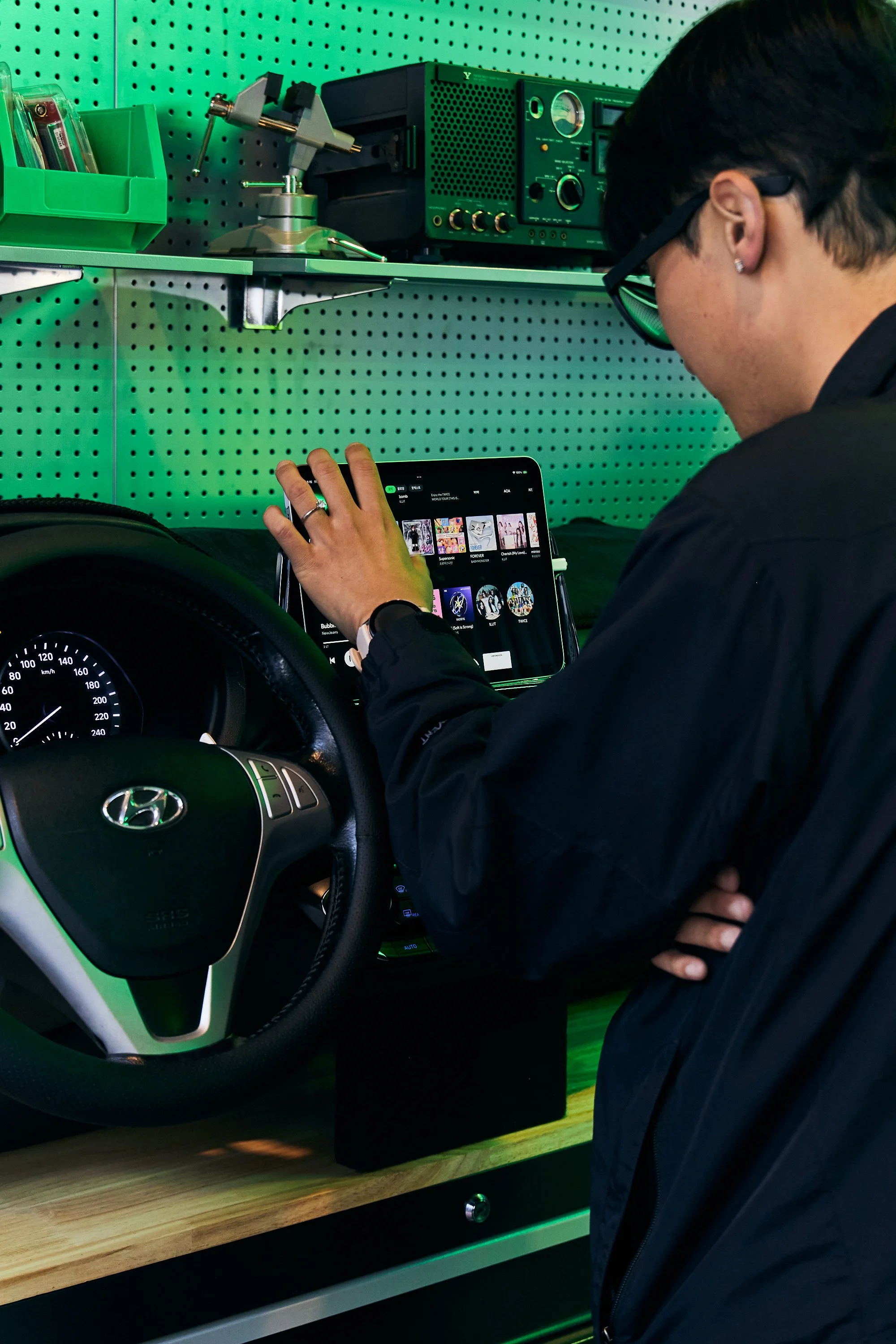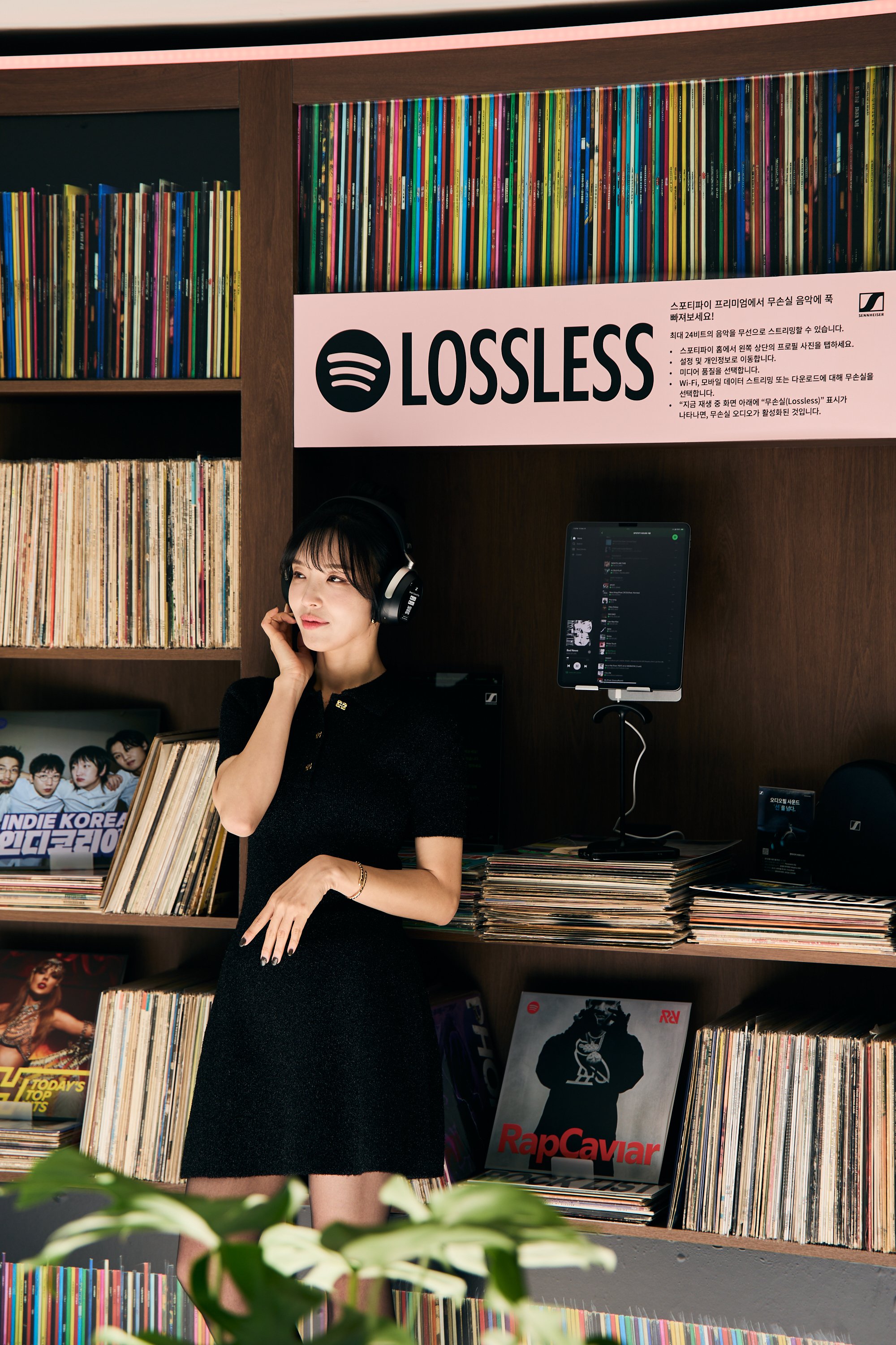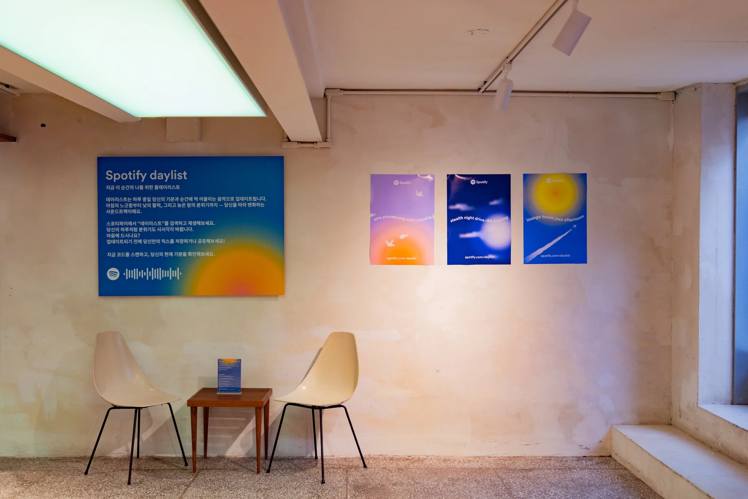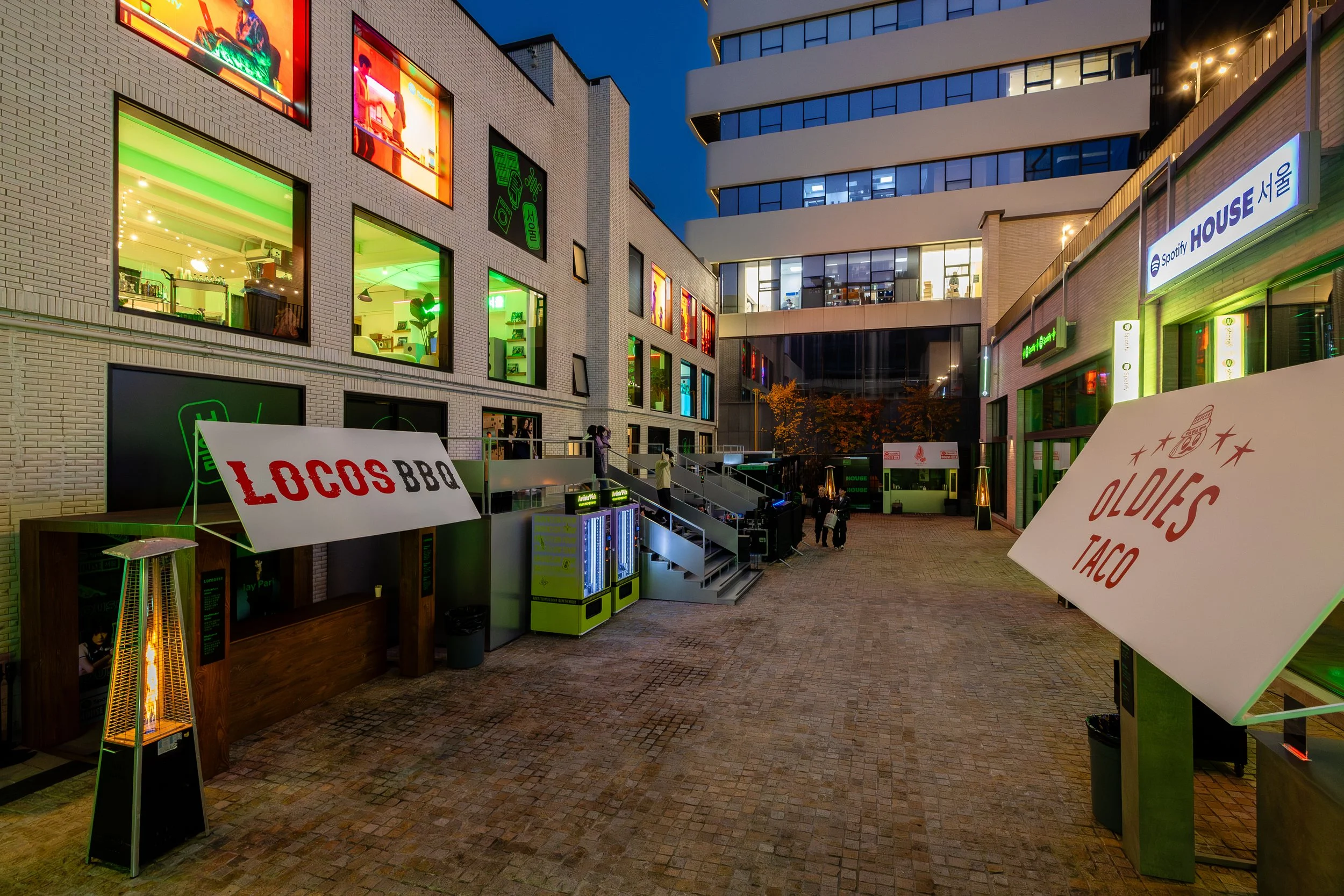 Guests entered and checked-in to Spotify House Seoul through The Connect Garage. After receiving their wristbands and maps, guests used a custom dashboard featuring Spotify Connect to play their favorite tracks via Carplay and Bluetooth, while promos for Spotify’s new Music Video feature looped on a TV nearby. Finally a green-lit Mercedes by lifestyle car culture brand Peǎches offered a photo-op on the way into Audiophile Alley.