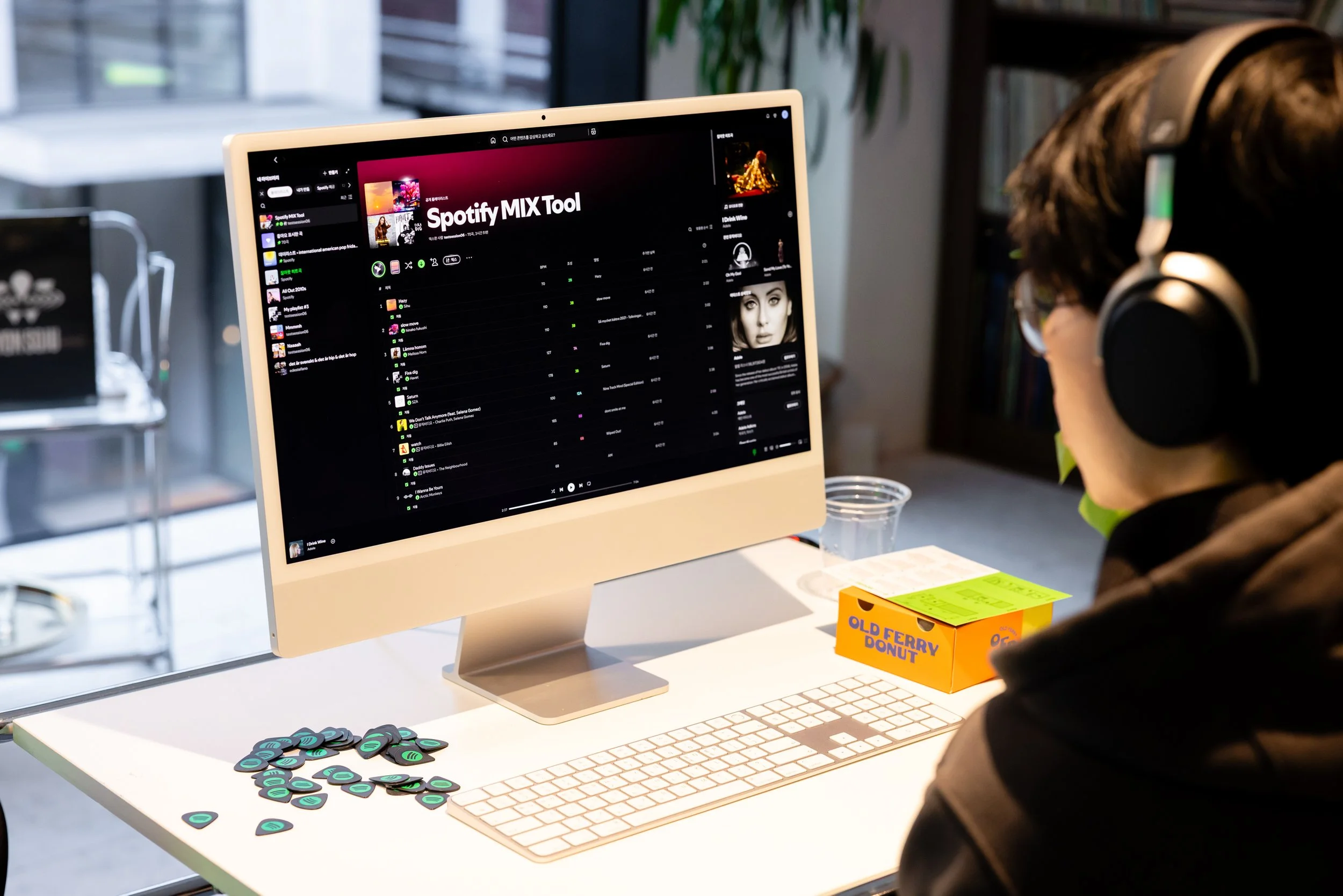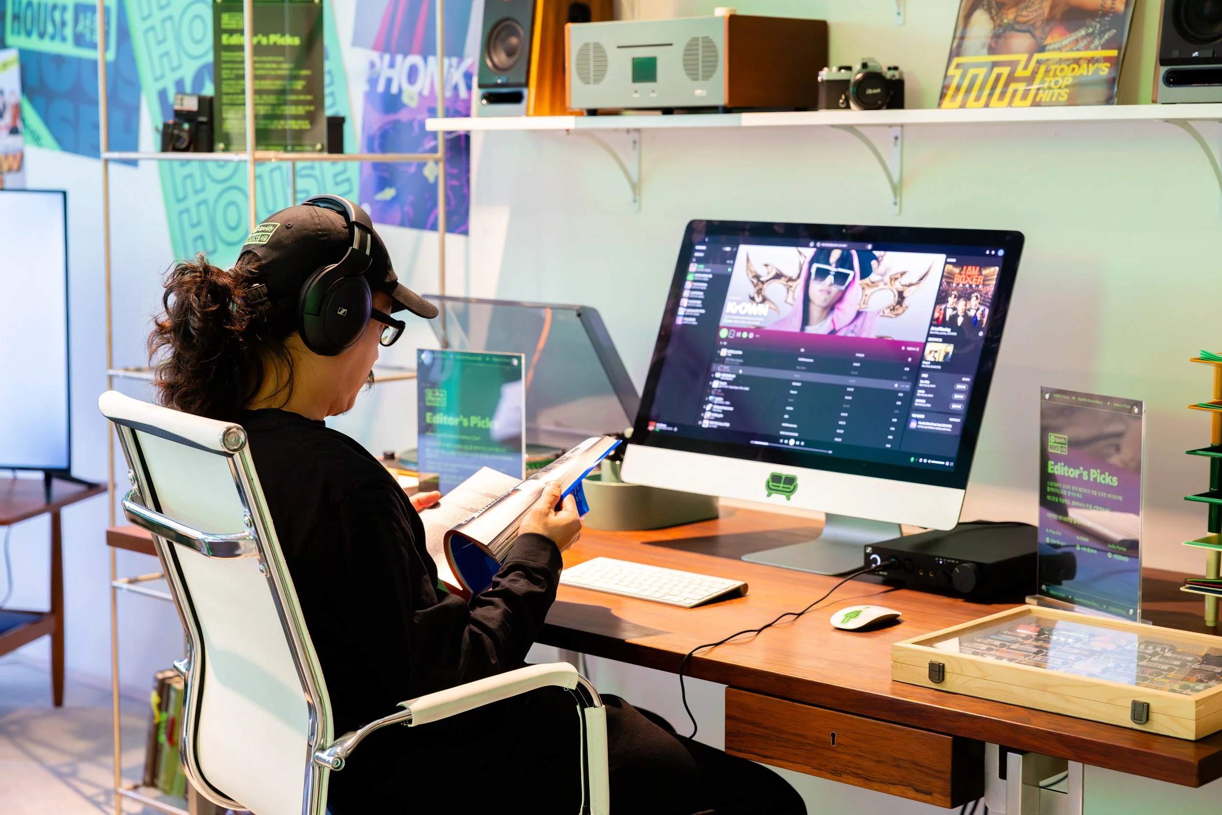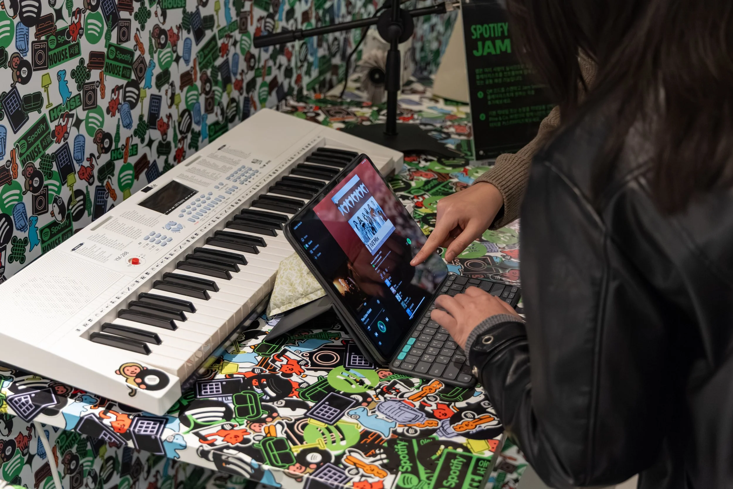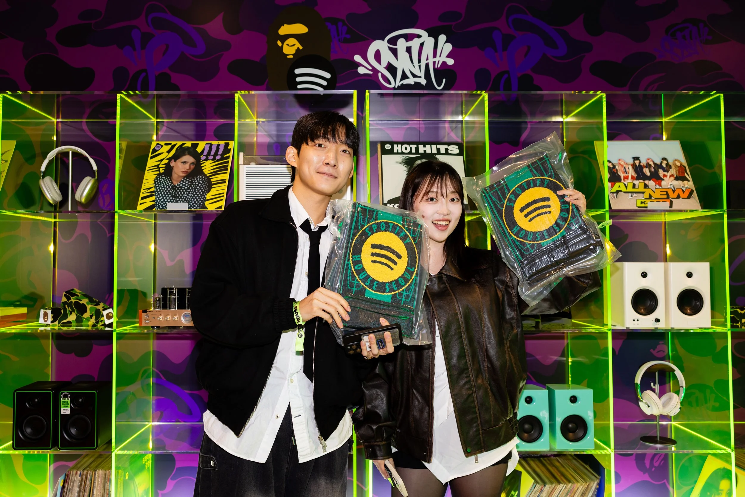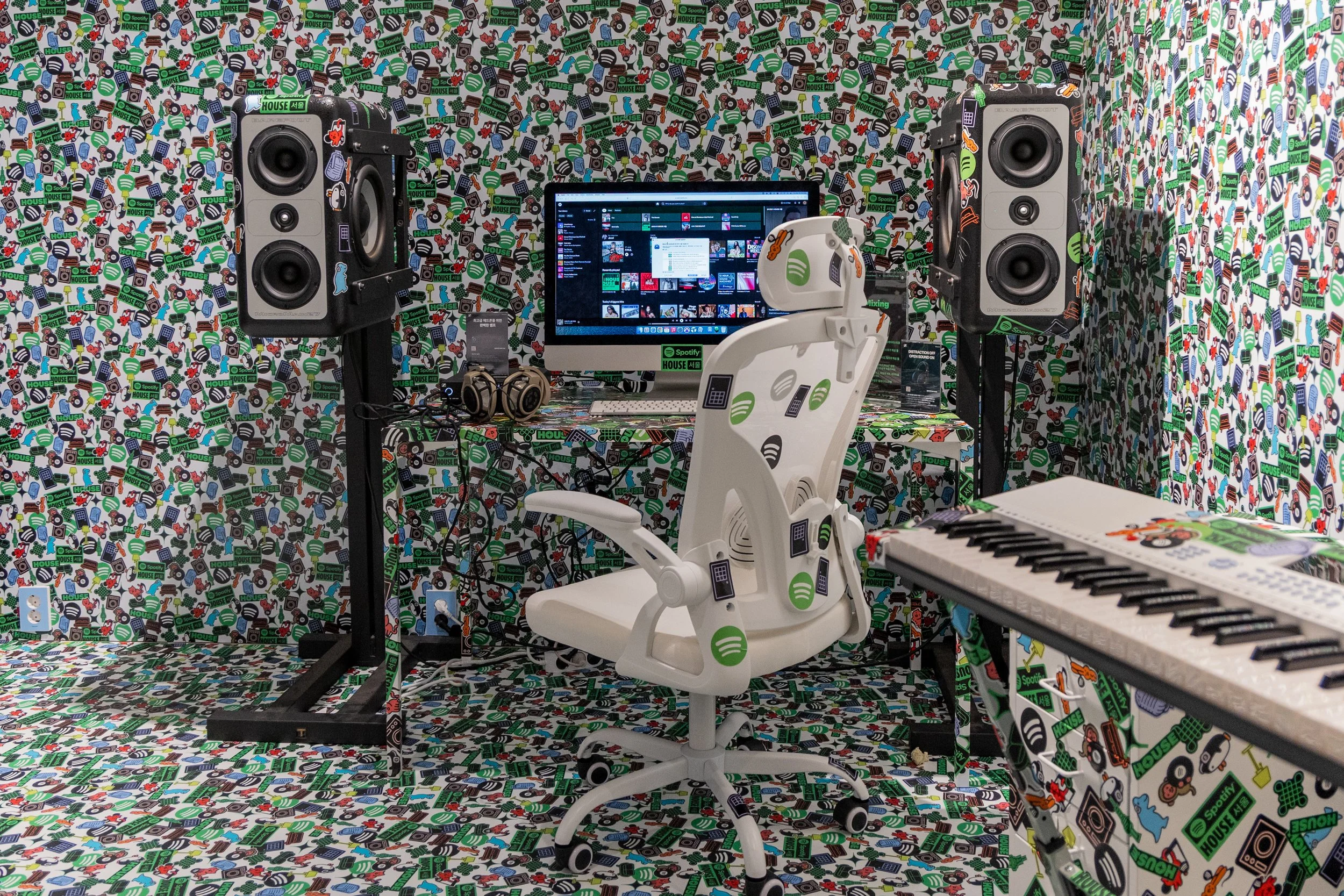 Through a hidden entrance inside the living room record shelves, guests slipped into the Sticker Bomb Studio: a white-walled recording studio transformed into a living artwork, layered with vibrant stickers and Spotify Codes linking to artist-curated playlists. QR codes scattered throughout the space unlocked hidden merch giveaways, exclusive sticker packs by Korean artist Good Morning Town invited guests to contribute to the evolving visual story of the room, Brand Ambassadors captured the experience with Polaroid cameras for instant keepsakes, and guests had a second chance to experience Spotify Lossless at the mixing table using producer quality headphones.