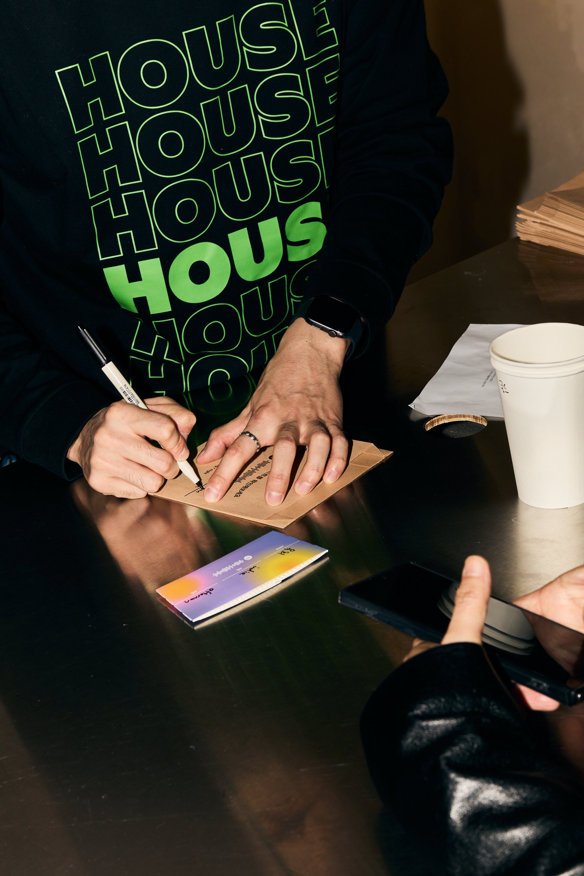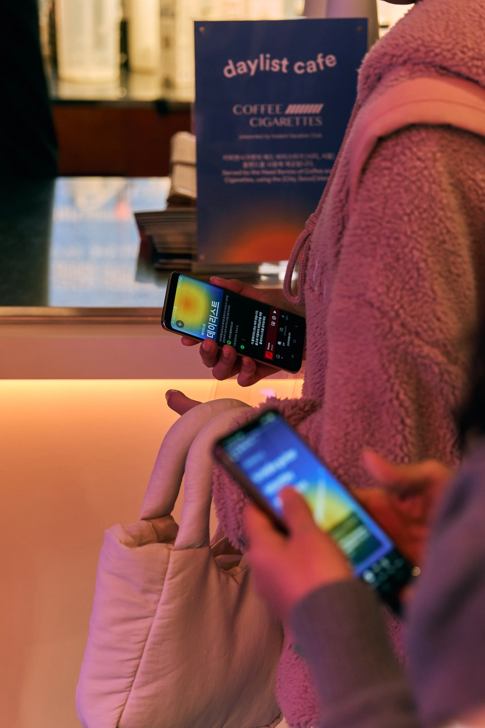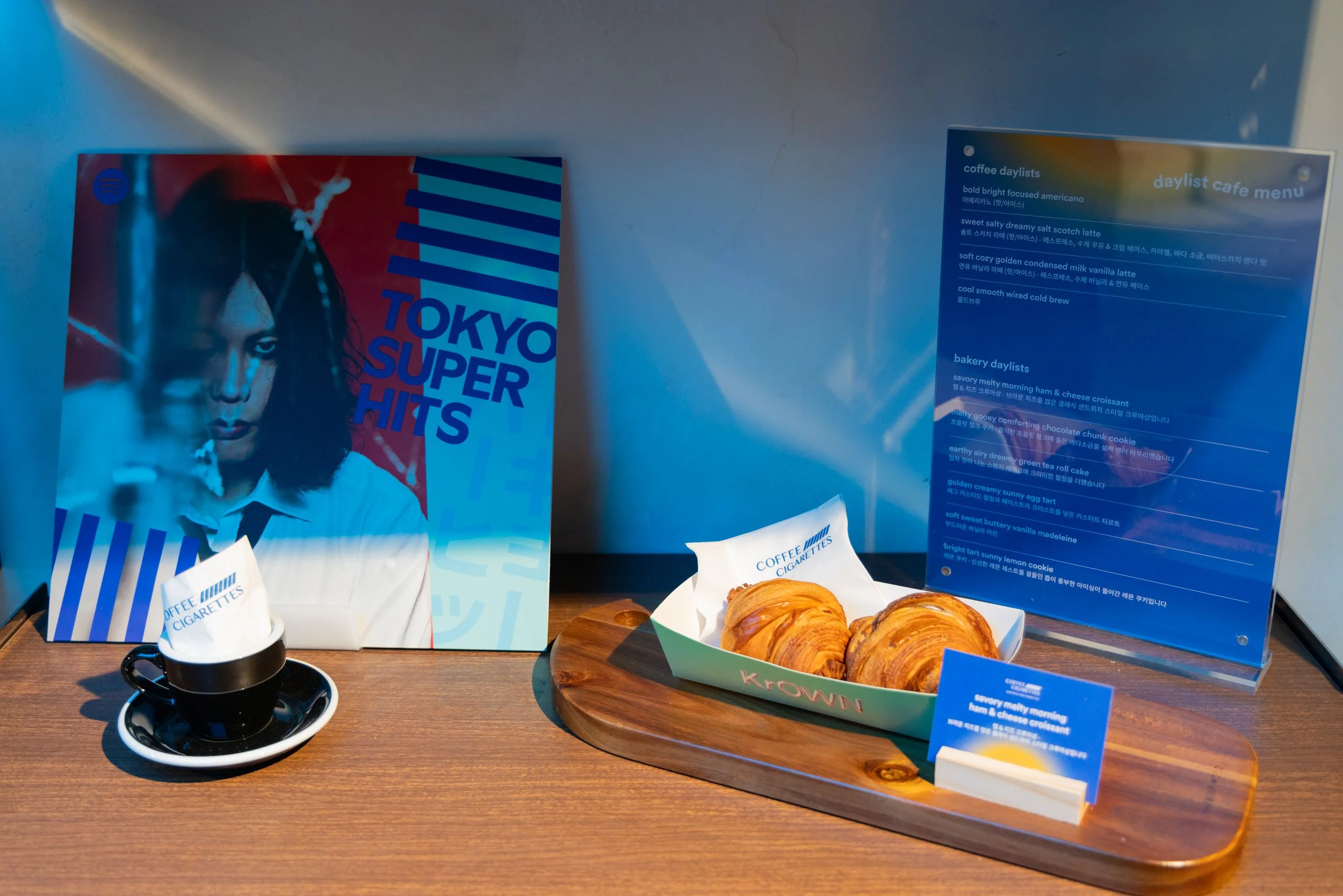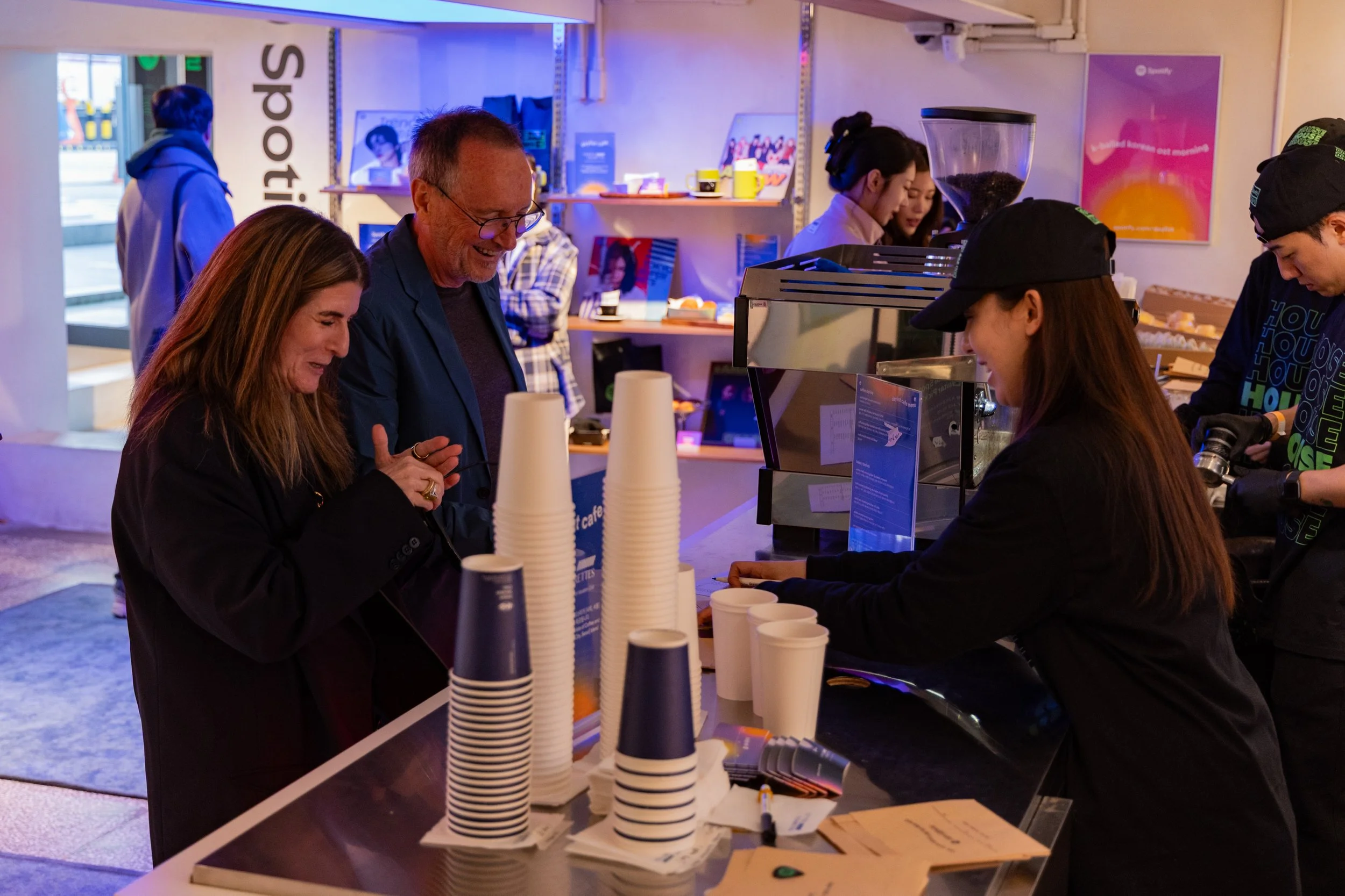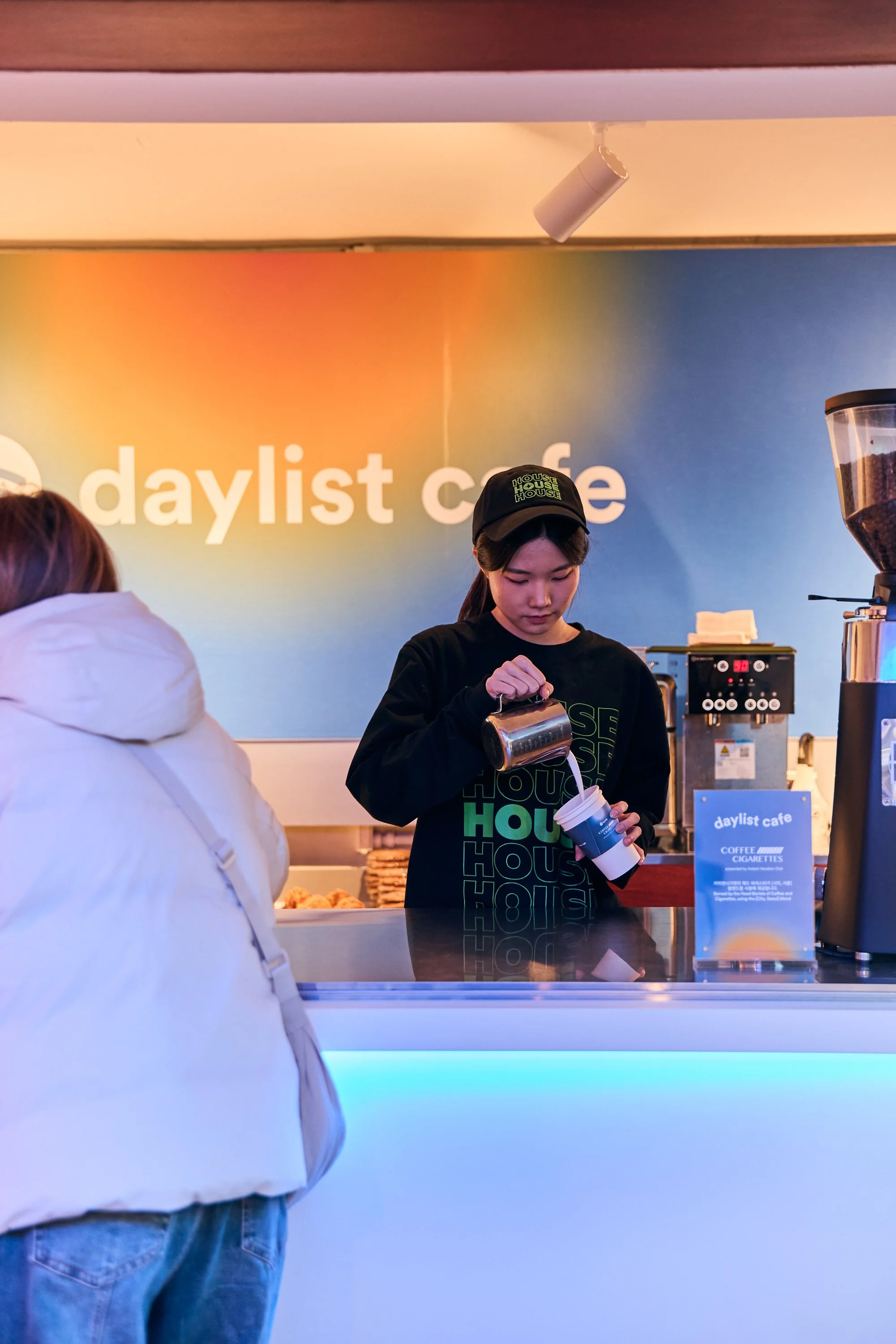 The Daylist Cafe opened its doors two days before the main House opening, serving as a pre-event teaser and intro to the experience. It featured limited‑edition drinks and treats from Coffee and Cigarettes, merch, and surprise ticket drops. The menu, lighting, and DJ sets changed throughout the day to echo the functionality of the Spotify Daylist feature, and guests were able to scan Spotify codes on the F&B packaging to preview event playlists in-app.