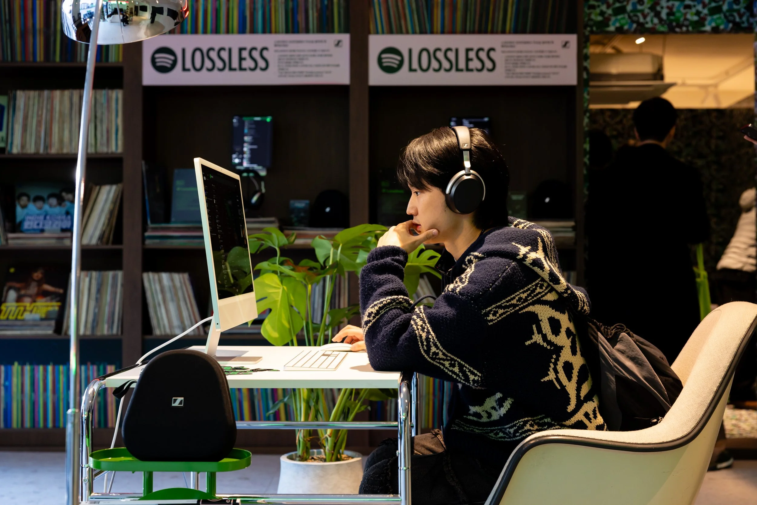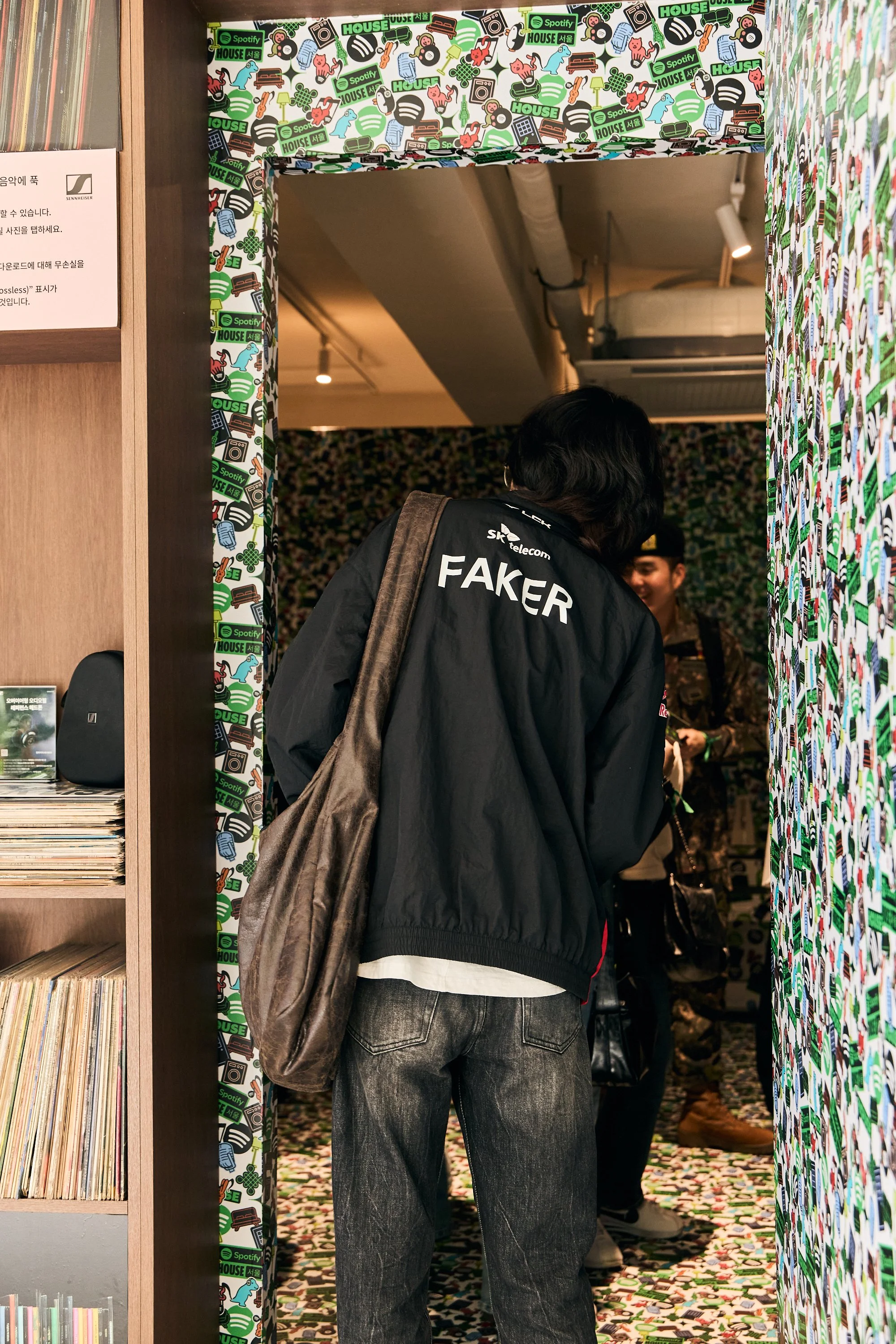 The Lossless Living Room gave guests a sneak peek inside a Spotify Editor’s private listening lounge. The widescreen TV looped music videos for guests to jam out to while picking up the green Spotify phones to listen to messages from their favorite artists. On the opposite side of the room, listening nooks in the record shelves housed demos for Lossless, Spotify’s new HiFi streaming offering, prior to its release on Spotify Premium. Guests could then take a seat at the desk to experiment with the new Mixing Tools feature on the app and sip a Won Soju cocktail from the pop-up bar, before slipping through the hidden door in the record shelves leading to the Sticker Bomb Studio.