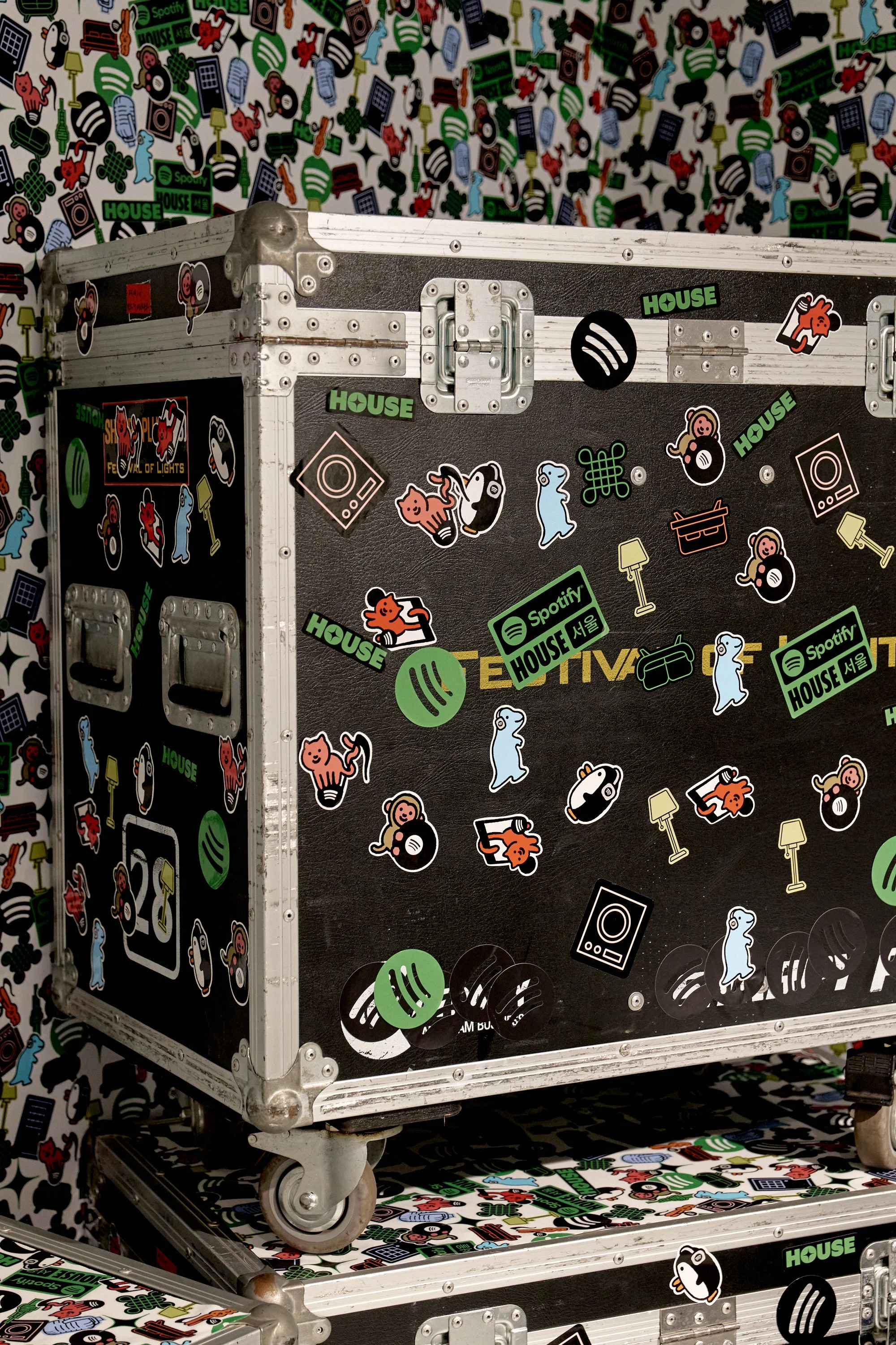 A sneaky re-entry point to the alley, the Artist Utility Room was styled after a touring artists’ home storage space, packed with shelves full of music equipment, tour merch, road cases, and instruments, tucked alongside everyday household items. Spotify House branding was tucked throughout to serve as one last photo-op as guests exited the main building.
