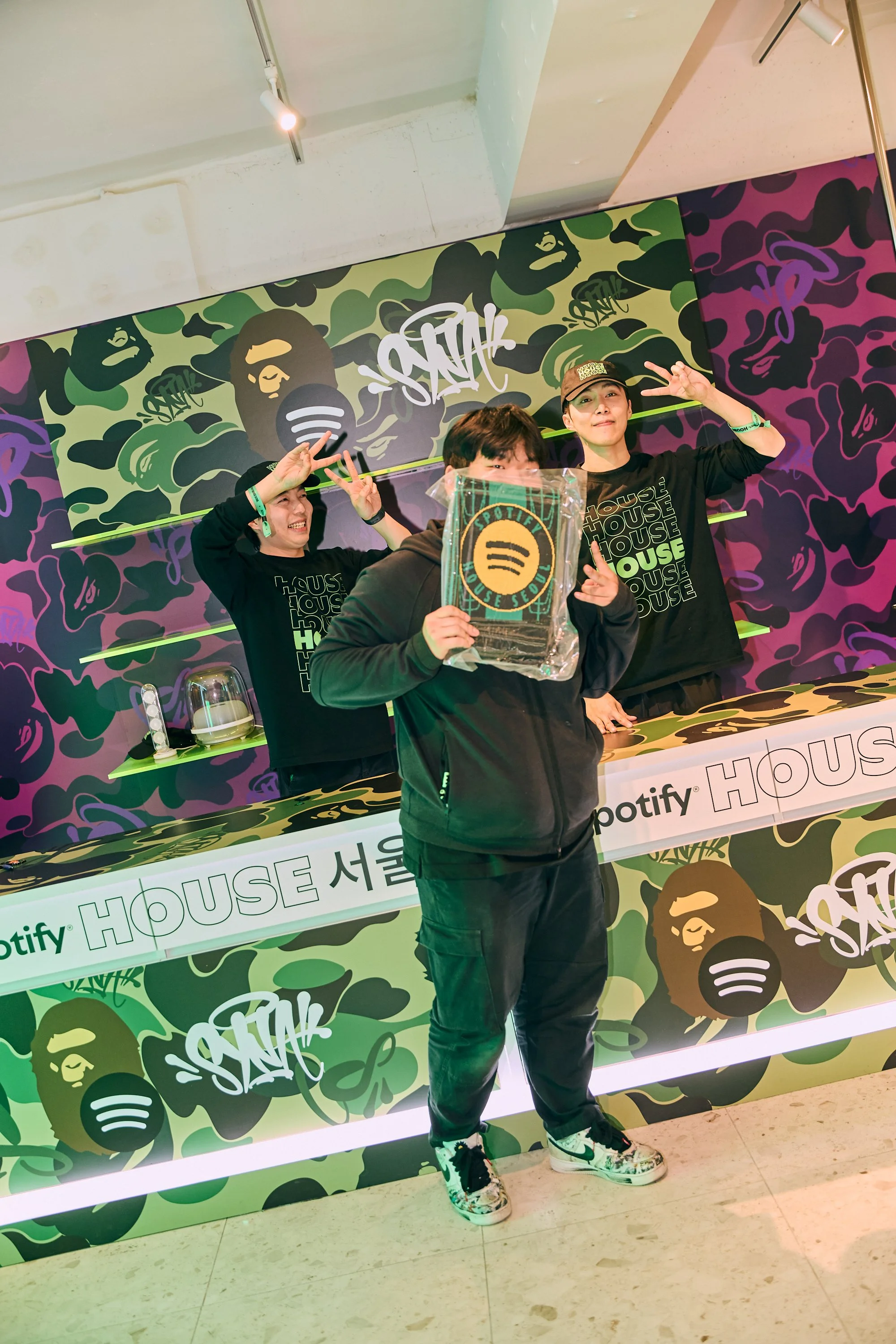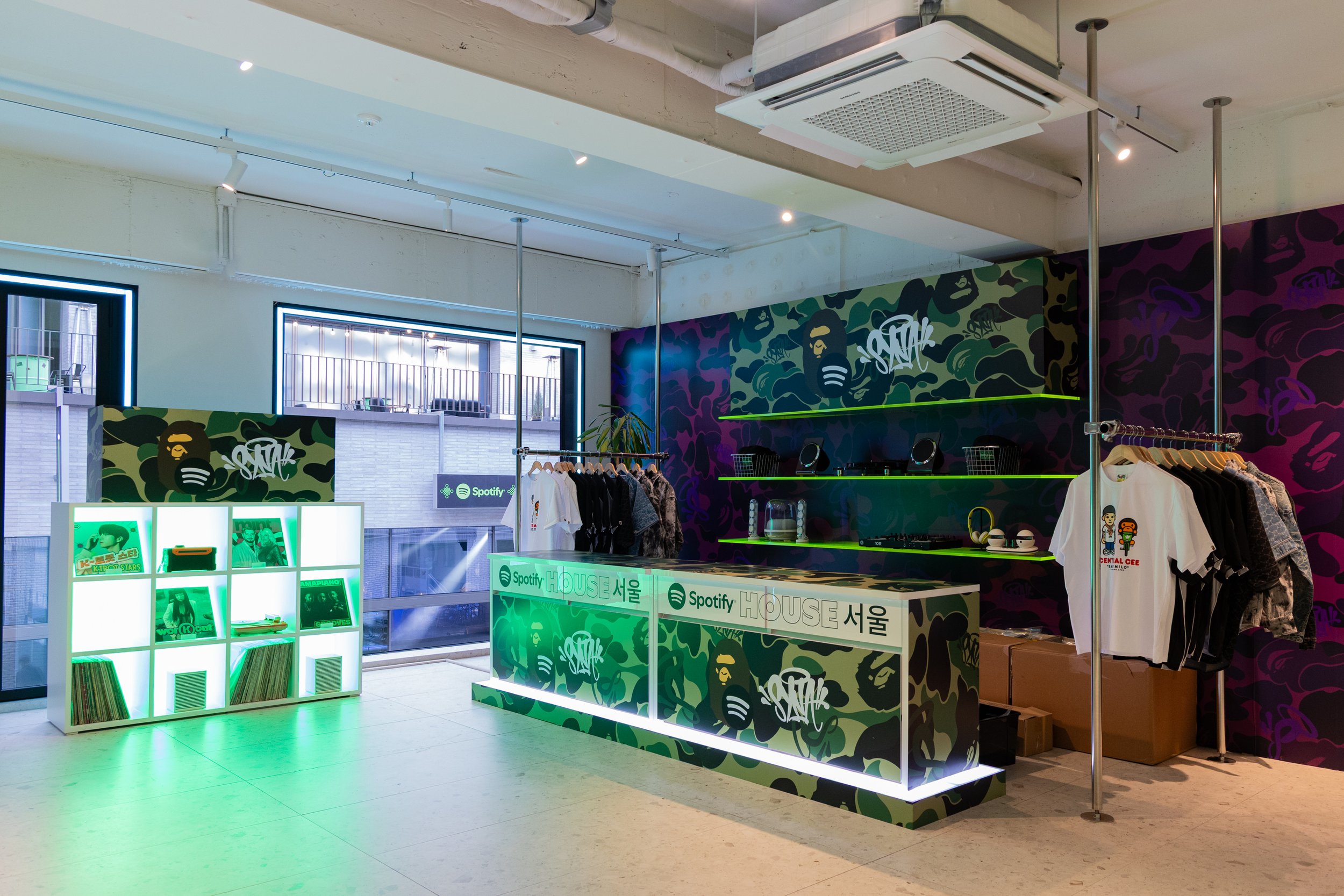 Attached to the Bedroom, the Spotify Closet was a high-end, Seoul-inspired concept store where fans could shop around and claim their merch. The Closet featured a limited drop of custom merch specifically made for Spotify House Seoul as well as curated streetwear pieces from BAPE®.